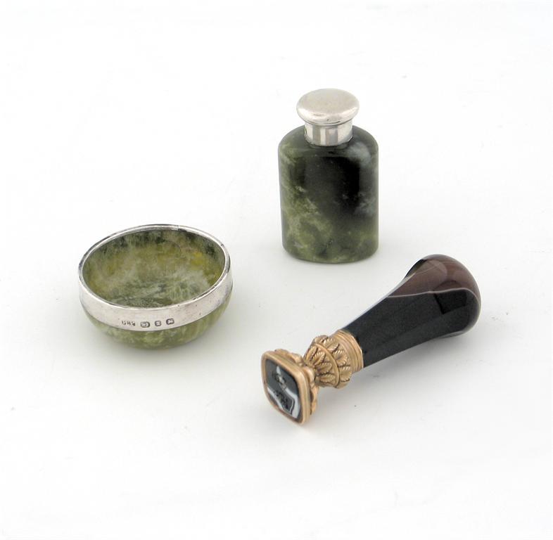 A late Victorian mounted Connemara-marble scent bottle, by Sampson Mordan, London 1889, a mounted salt, Birmingham 1897 and a Victorian gold mounted agate seal, with intaglio initials, the latter 2.5in (6.3cm) high. (3)