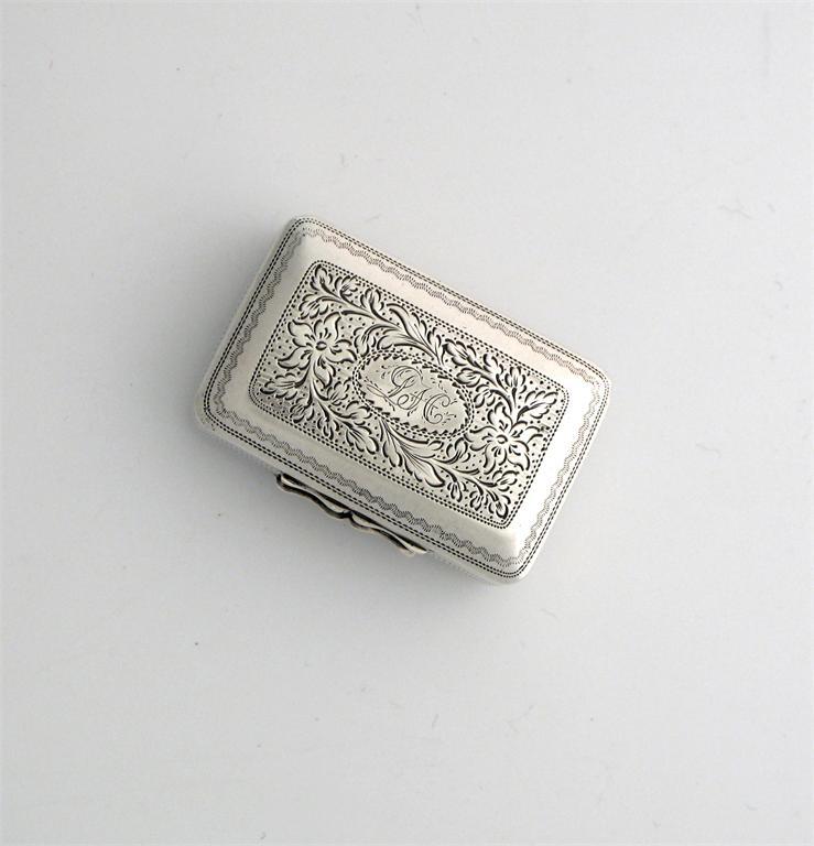 A George III vinaigrette with floral engraved panels, pierced feather grill and initials L J C, by Simpson and Son, Birmingham 1818