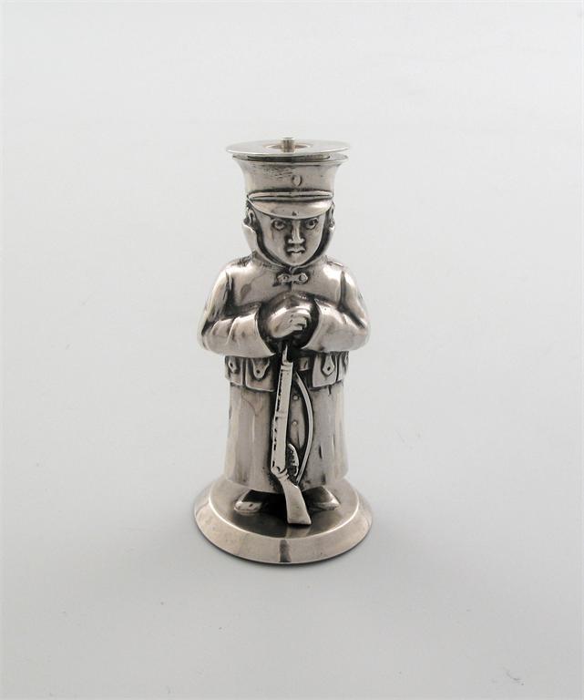 An Edwardian novelty cigar lighter, in the form of a sentry, by Deakin & Francis, Birmingham 1909, cover unmarked, 3.25in (8.2cm)