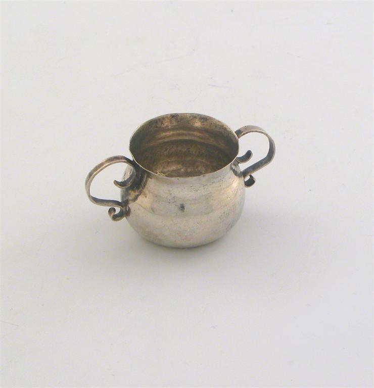 A late 17th century/18th century miniature or toy porringer, plain with s-scroll handles, unmarked 1690-1720, 1.45in (3.6cm) diameter, 0.5oz.