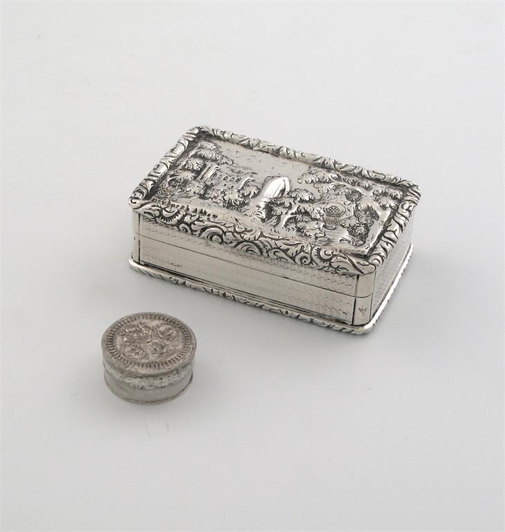 A William IV 'castletop' snuff box with a view of Dryburgh Abbey, the sides and base engine-turned within foliate borders, engraved initials HNB, by Joseph Wilmore, Birmingham 1835, 2.75in (7cm), 4.3oz