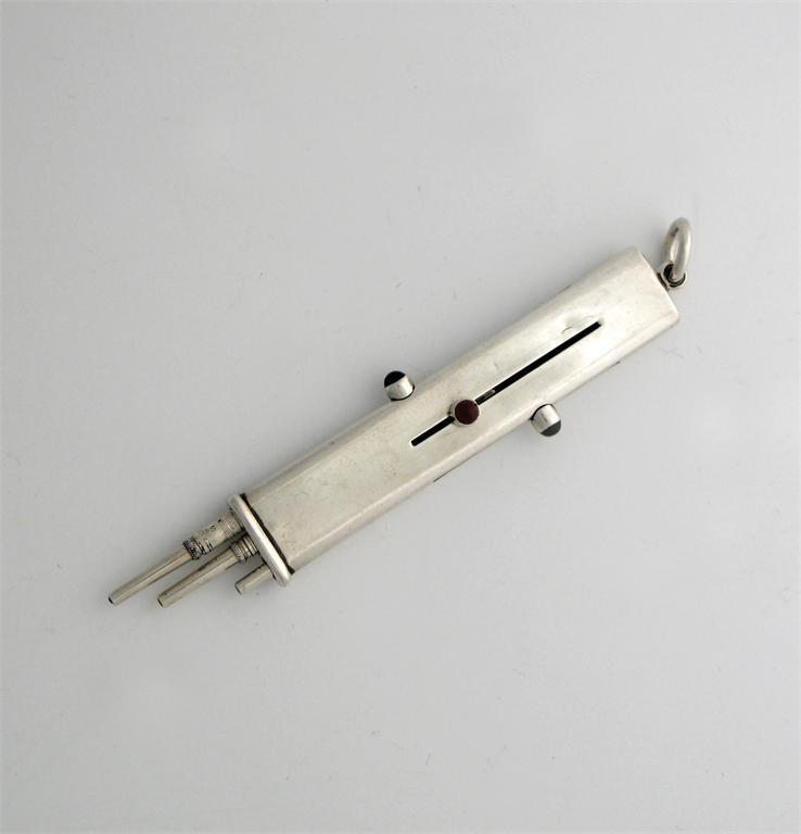 A late Victorian three colour propelling pencil, of flat section, the slides set with coloured stones, with suspension ring, by Samson Mordan & Co, stamped sterling silver 3.2in (8cm)