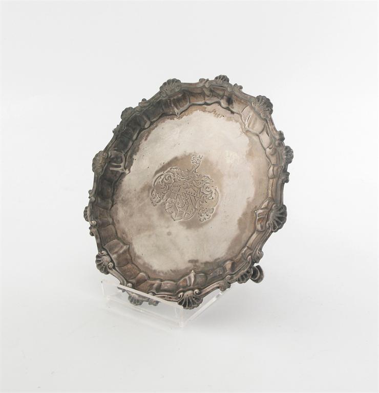 A George II waiter, with a shell and scroll border and an engraved armorial, the base initialled 'S H', makers mark overstruck, London 1759, 6.75in (17cm) diameter, 7oz.