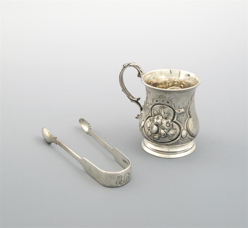 A Victorian small embossed mug, of squat baluster form, initialled, gilt interior, by Alfred Spark, London 1854 together with a pair of George III fiddle pattern sugartongs, the mug 3.5in (9cm) high, 5.75oz. (2)