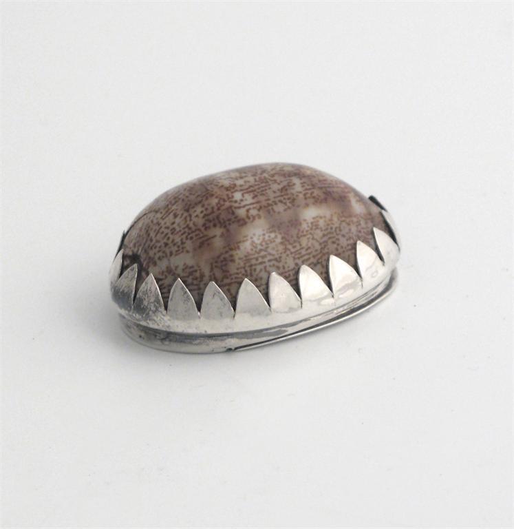 An early 19th century mounted natural shell snuff box, the hinged cover crested above the initials 'RL', unmarked, c.1800, 2in (5.1cm) long.