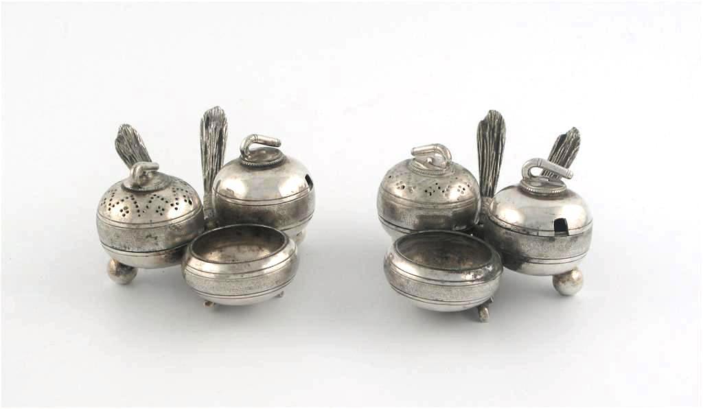 Sporting interest: A pair of plated breakfast condiments, each comprising salt, mustard and pepper in the form of curling stones.