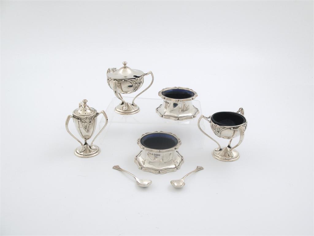 An Edwardian art nouveau, 3 piece condiment set with buttress supports comprising mustard and salt (blue glass liners), a pepperette and two matching spoons, by E.S. Barnsley Ltd, Birmingham 1906/1907 together with a pair of mern spool shaped salts (with blue glass liners) with petal shaped borders, Sheffield 1917, 9.5oz weighable silver. (7)