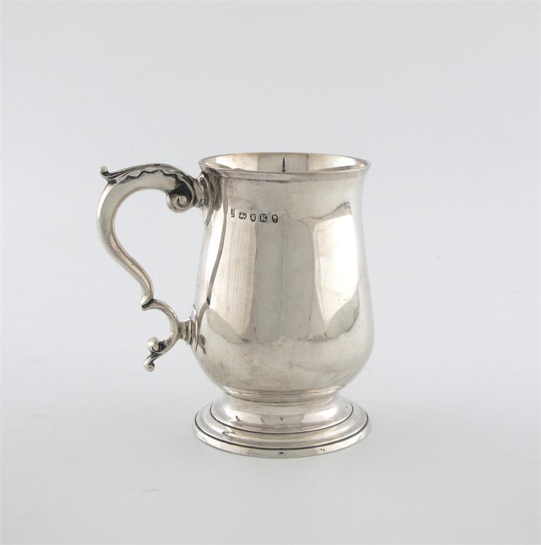 A George III baluster mug, on a spreading foot with a leaf capped scroll handle, initialled 'WB', Peter Ann & William Bateman, London 1805, 5in (12.9cm) high, 10oz.