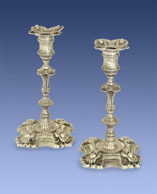 A pair of cast, George II candlesticks, with knopped and decorated columns on chased, decorative bases, with an applied putto-mask on each corner, the detachable nozzles with chasing and applied masks, by John Cafe, London 1750, 8in (20.3cm) high, 31oz (2)