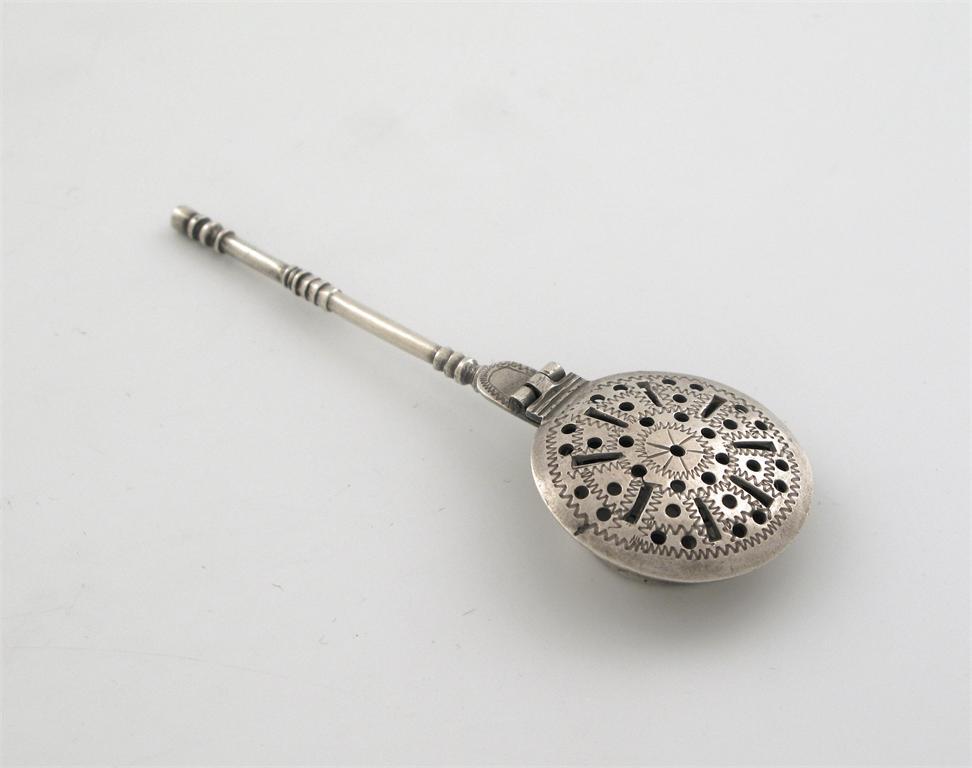 A late 19th century Dutch miniature warming pan, pseudo Amsterdam marks, 4in (10cm) long