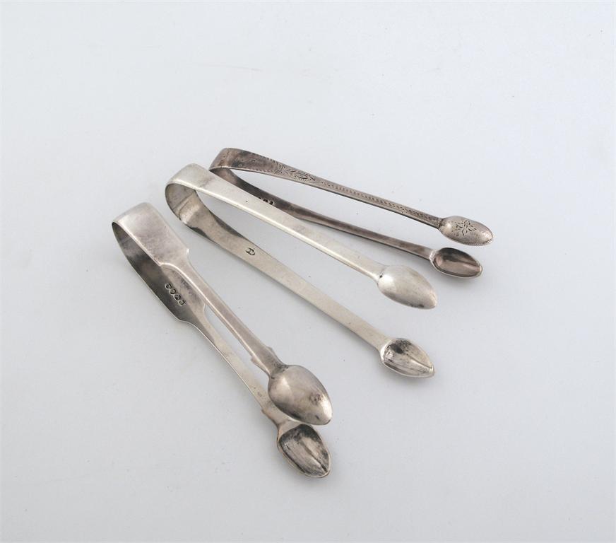 A George II pair of sugar tongs, Fiddle pattern, makers mark W.B., possibly for Richard Watts, London, 1757, together with two George III pairs of sugar tongs, one by George Wintle, the other marked I.L. possibly for James Long, 3.5oz. (3)