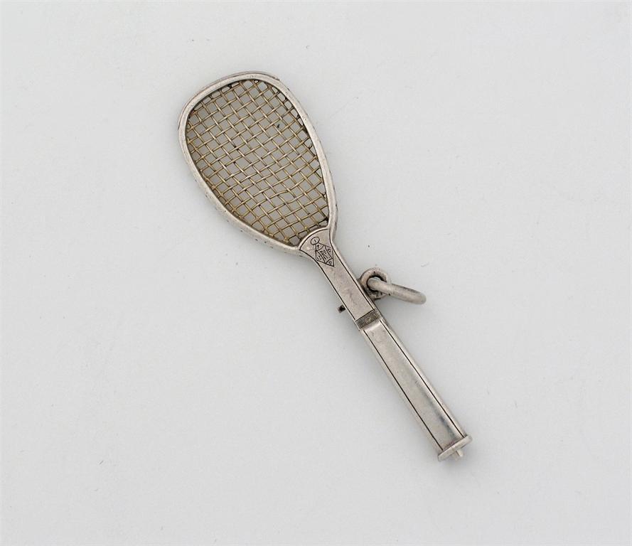 A rare Victorian telescopic pencil, in the form of a tennis racket, with incuse registered design lozenge and a French duty mark on the suspensory ring, c.1880, 2.5in (6.5cm) long.