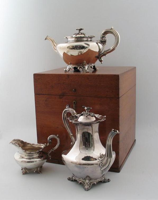 A Victorian matching coffee pot, teapot and milk jug, plain circular with scroll borders and ornate feet, the pots with flower finials, initialled and crested, by Messrs Barnard, London 1837/38 (contained in a mahogany box), 62oz weighable silver.