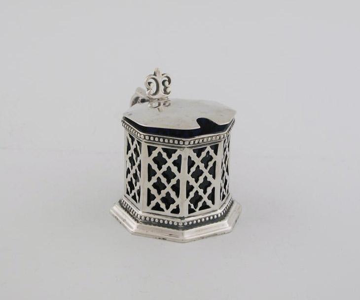 A Victorian pierced octagonal mustard pot, with blue glass liner and bead borders, the cover with pierced scroll thumbpiece, by H.Wilkinson & Co, Sheffield 1852, 3.3in (8.3cm) high, 4oz weighable silver.