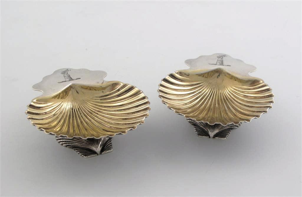 A pair of Victorian scallop shell salts with gilt bowls, each raised on a small scallop shell foor, crested, by John Watson, Sheffield 1843, 3.5in (9cm) wide, 3.5oz (2)