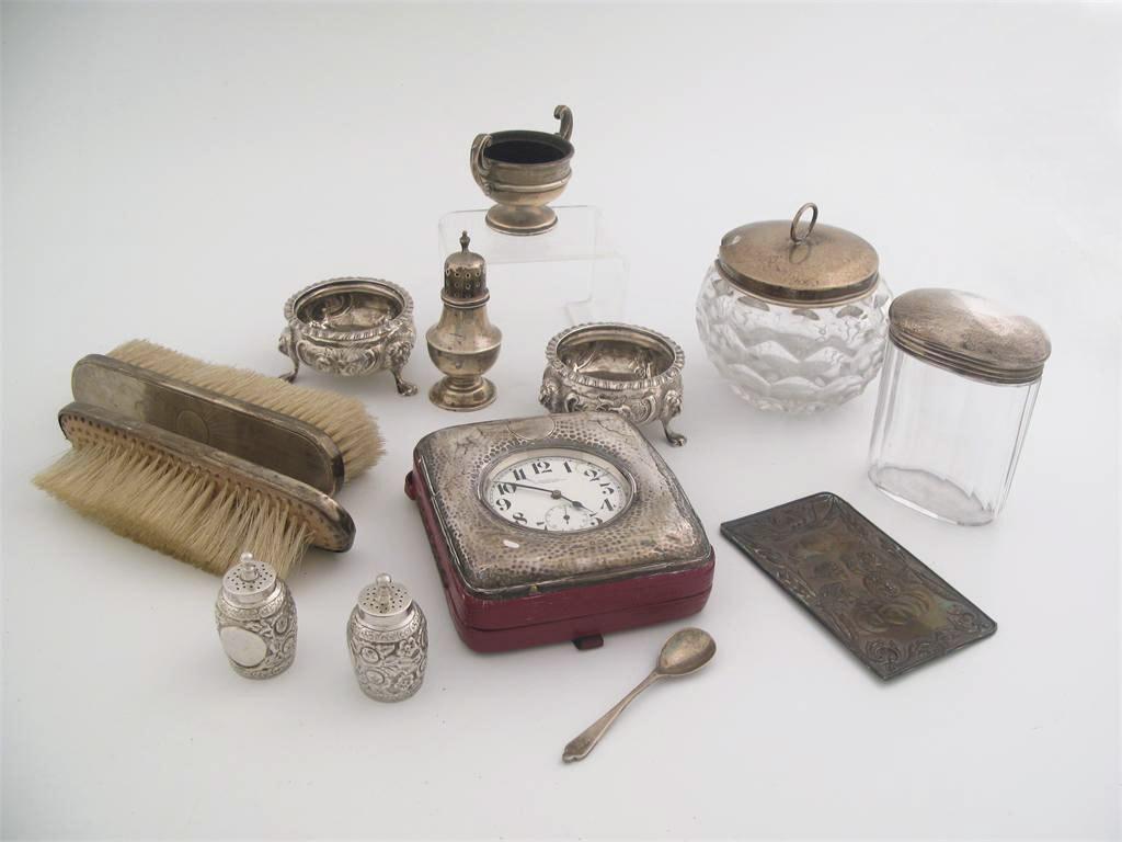 A pair of Victorian embossed circular salts, by W.R.Smily, London 1856, a small pair of embossed peppers, by Edward Hutton, London 1888, two cased sets of three condiments, a small crested pepper and a two handled cup, a glass preserve pot with silver cover, a glass dressing table hair pin jar with silver cover, an embossed plaque and two silver backed clothes brushes. (lot)