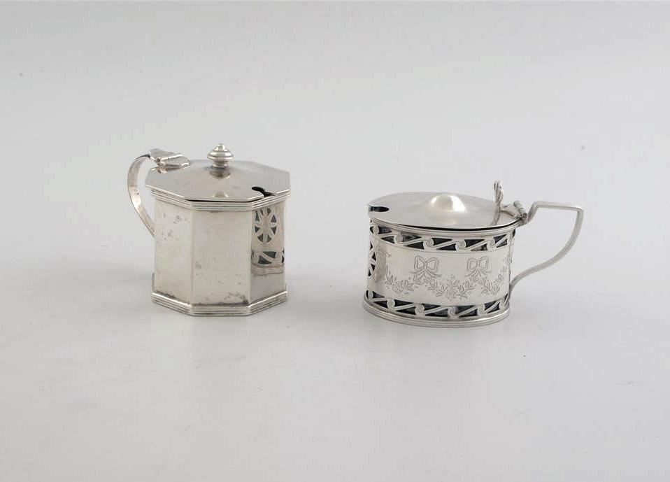 An oval mustard pot engraved with ribbon-tied floral swags and fret boarders, by Adie Bros, Birmingham 1924, blue glass liner, also an octagonal mustard pot, Chester 1906 (no liner) (2)(2).