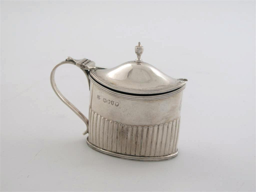 A Victorian oval mustard pot, Part fluted, with urn finial, by Boadbury Henderson London 1884, blue glass liner. 3ozs.