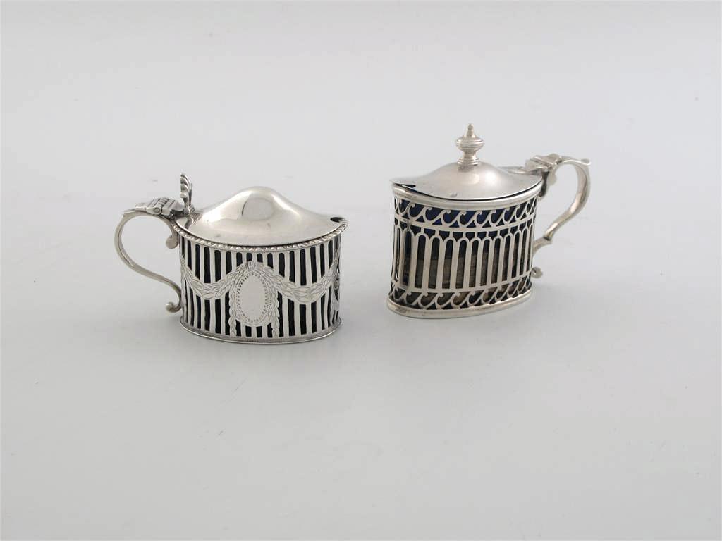 CRACKED LINER An oval mustard pot, fret, with laurel swags and gadrooned border, by Goldsmiths & Silversmiths Co. London 1910, blue glass liner, also an oval mustard pot, fret, with urn finial, by Walker and Tolhurst London 1892, cracked blue glass liner (2)