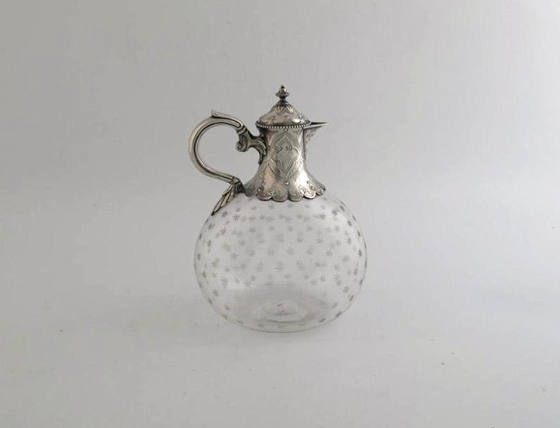 A Victorian mounted glass claret jug, star cut decoration, the mount with two quatrefoil vacant cartouches and scroll handle, by E.C. Brown, London 1868, 8in (20.3cm) high