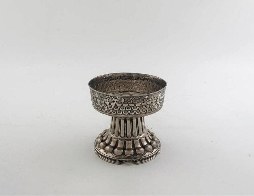 An Edwardian copy of a medieval font cup, with fluting and scale decoration and Lombardic inscription, by G Nathan & R. Hayes, Chester 1908, 4.1in (10.5cm) high, 11oz.