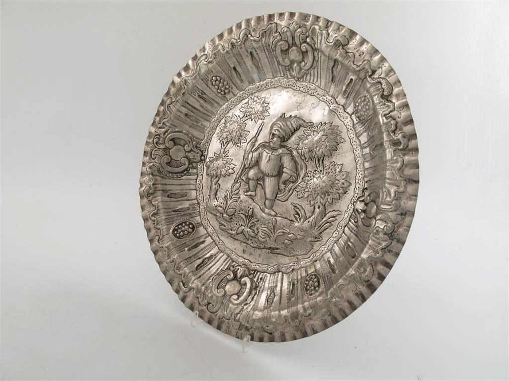 An 18th century embossed sideboard dish, with a crimped rim, the centre depicting a dwarf pilgrim, the reverse with an assay scrape and initials, probably Spanish (town mark a bull in a shell, maker mark probably worn 'sil?', assay masters mark and date, partially worn 1752, 12.3in (31.2cm) diameter, 11oz.