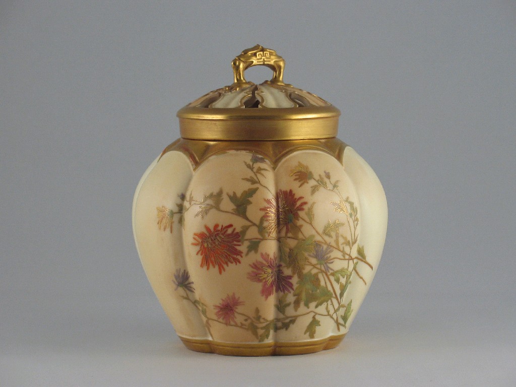 A Royal Worcester pot pourri vase and cover, and inner lid, decorated with flowers. Slight wear to the gilding. c.1900, 18.5cm. (3)