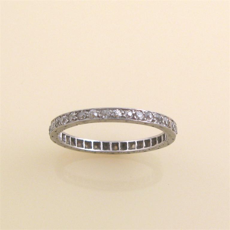 A diamond set eternity ring. Set all round with circular cut diamonds in platinum. Size J.