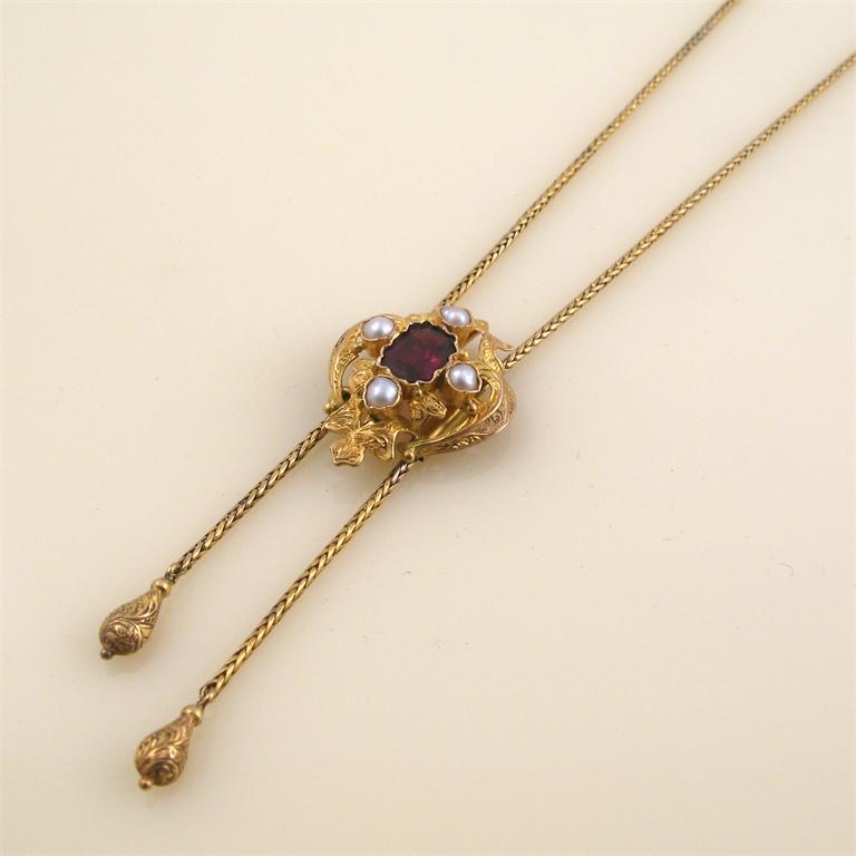 A Victorian gold necklace, the garnet and pearl slide to a foxtail link chain with engraved barrel clasp and drops. The necklace approx. 40cm long.