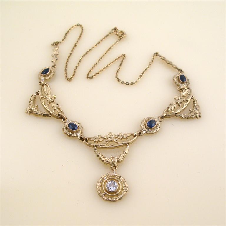 A gold necklace set with diamond and quartz blue stones numbered to the reverse.