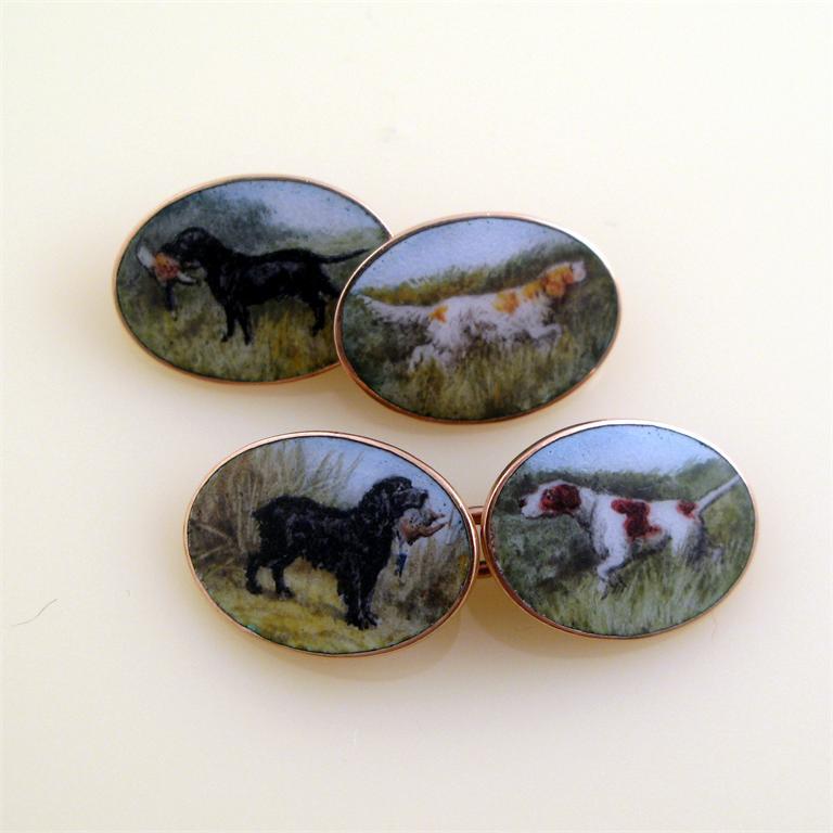 A pair of enamel and gold dog cufflinks. Depicting a Pointer, Spaniel, Labrador and English Setter.
