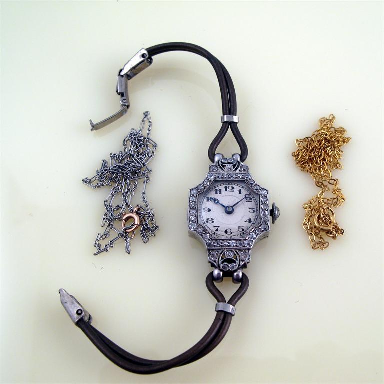 A lady's diamond set platinum wrist watch, the square bezel with canted corners, foliate style lugs and winder all set with circular cut diamonds, the dial with Arabic numerals, and jewelled lever movement signed Elem. W. Co., (not working). Later strap. Together with a fine platinum chain and a gold coloured chain. (3)