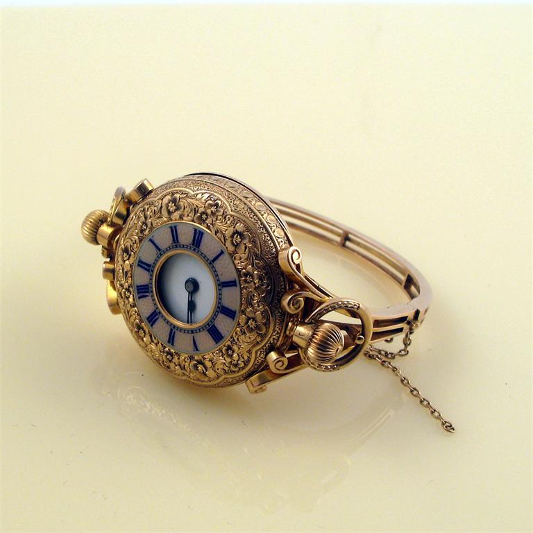 An 18ct gold half hunting cased fob watch. Foliate engraved gold cover with blue and pink guilloche enamel chapter ring. Plain white enamel dial. Swiss movement. With a gold wrist watch frame with false winder and pendant loop. The frame 25g.