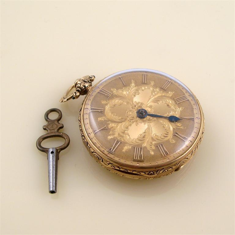 A 19th century 18ct gold open face pocket watch, the engraved gilt dial with Roman numerals, (hand missing) with an unsigned gilt verge movement No. 5666, all in a foliate chased and engraved case. Key.