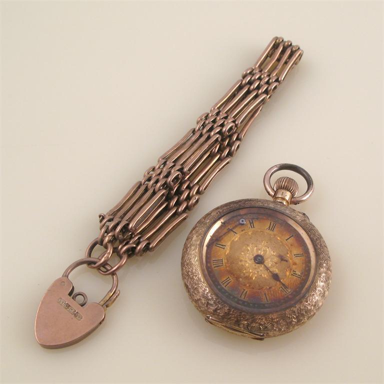 A 9ct gold gate link bracelet, with heart padlock clasp, 12g and an engraved 18ct gold open face fob watch, the engraved gilt dial with Roman numerals, (one hand detached). (2)