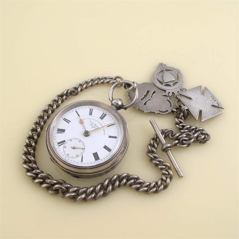 A open faced silver pocket watch. Cased marked for Chester 1904. The white enamel dial signed 'Graves of Sheffield'. With subsidiary seconds dial. Silver graduated curb link watch chain and three silver medallions including a Pigeon Racing Club.