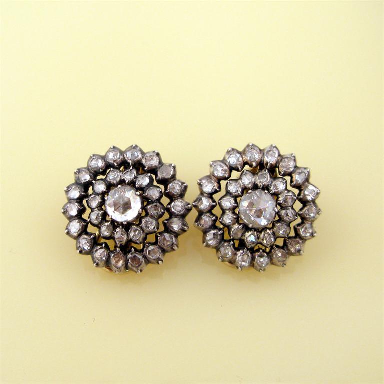 A pair of diamond cluster earrings. The centre rose cut diamonds are set within two rows of smaller rose cut diamonds in silver and gold.