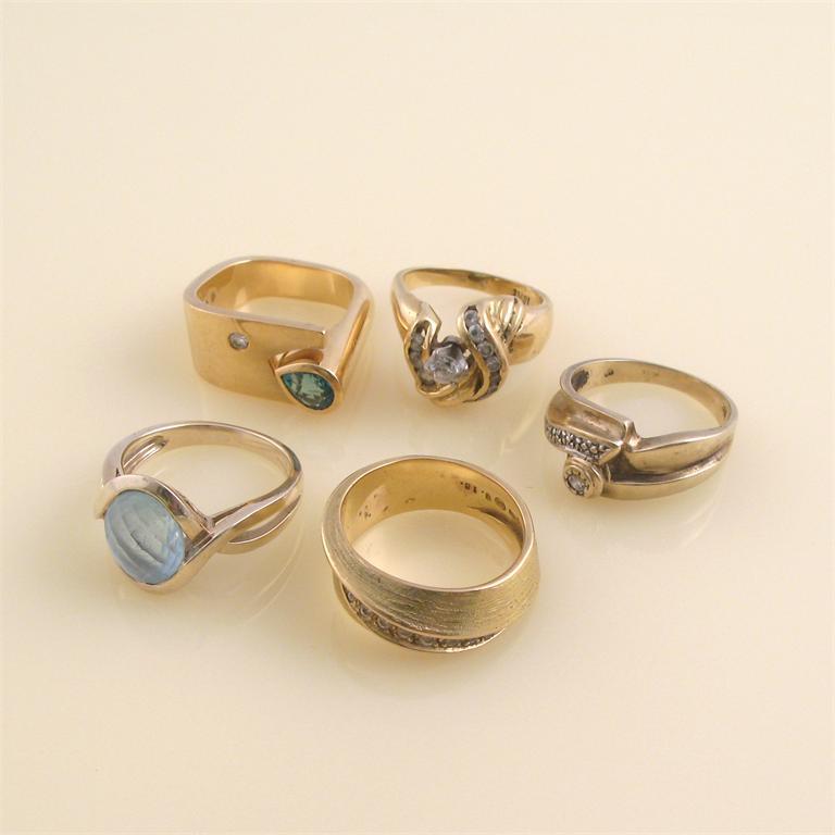 Five assorted gemstone and diamond set rings. 39g in total.