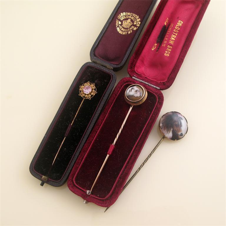 An early 19th century stick pin, the pink topaz mounted with a gold cannetille mount. With a gold stick pin painted with the head of a white dog. And another pin mounted with the painted head of a collie and signed to the reverse 'I W Bailey' beneath the name 'Sefton Hero'. With two cases.