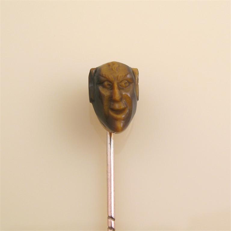 A gold stick pin with carved tiger's eye devil's head. 1.5cm high.