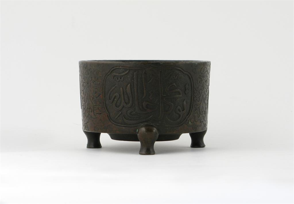 A Chinese bronze censer, made for the Islamic market, carved with three panels of Arabic calligraphy divided by stylized lotus, all raised on three feet, four character mark to the base, 17th century, 11cm. Provevance: By repute, the 1st Baron Amherst of Hackney, Didlington Hall.