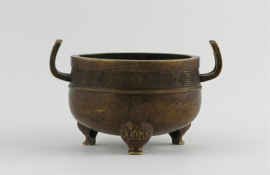 A Chinese bronze tripod censer, cast with a key fret band, the base with a four character mark, Yu Tang He Wan (antique trinket for the Jade Hall), Qianlong 1736 - 1795, 15.5cm.