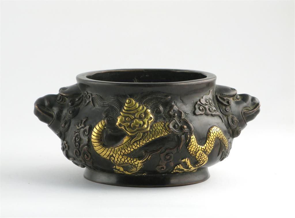 A Chinese bronze censer, cast in relief with scaly dragons highlighted in gold, the base with a Qianlong mark but 19th century, 17cm.