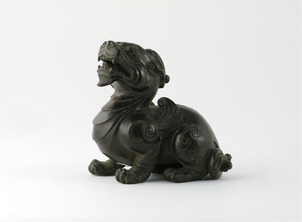 A Chinese bronze model of a crouching horned lion dog, baring its teeth, 17th/18th century, 14cm.