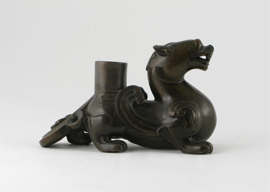 **A Chinese bronze model of a kylin, with a bifid scrolling tail, crouching and about to pounce, 17.5cm.
