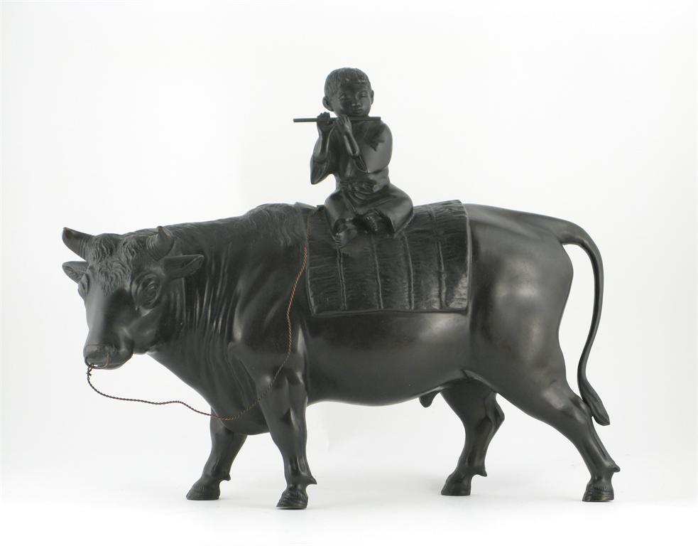 A large Japanese bronze model of a bull, his back with a small boy sitting playing a flute, probably Meiji period, 51cm.
