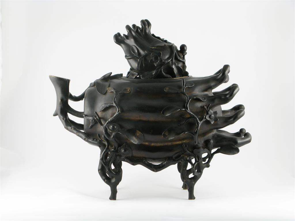 A large Chinese bronze incense burner and cover, in the form of a double finger citron, a seal mark to the base, traces of old gilding, probably 18th century, 49cm long. (2)