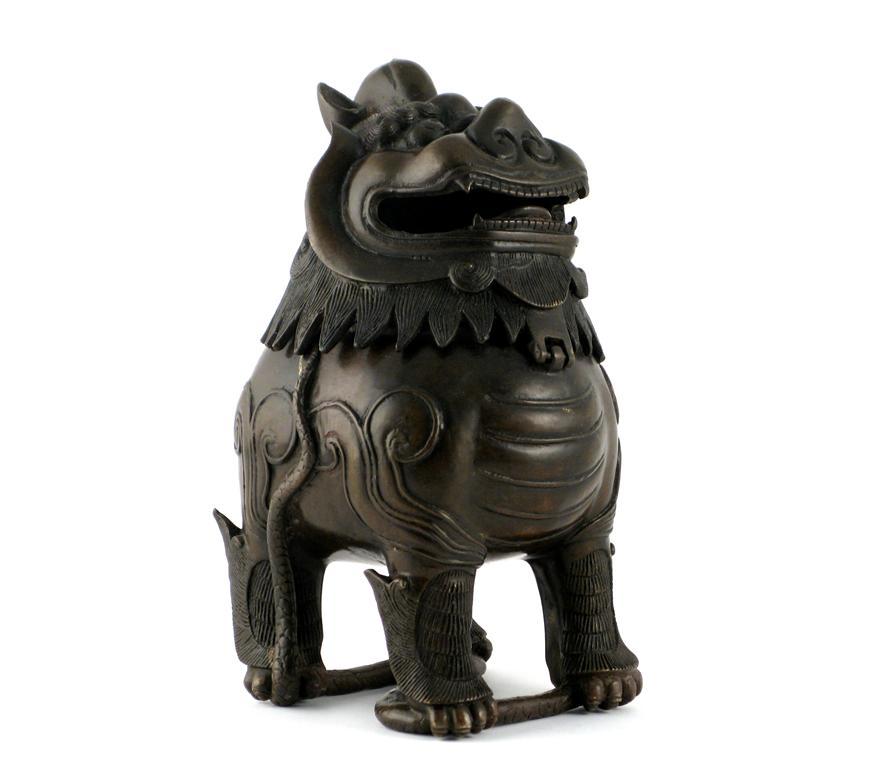 A Chinese bronze censer, cast as a stylized kylin, the hinged head with an upturned face, standing four square upon a snake, 18th century, 21.5cm.