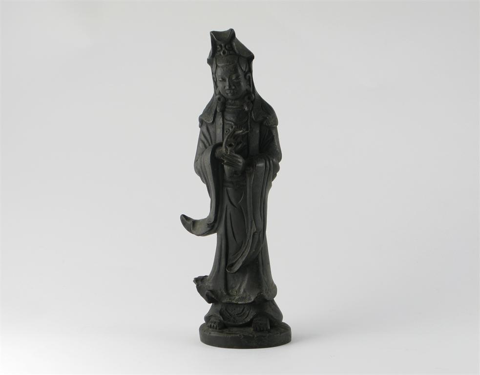 A Chinese bronze Ming-style standing figure of Guanyin, standing holding a flask in her left hand, damages, 25.5cm.