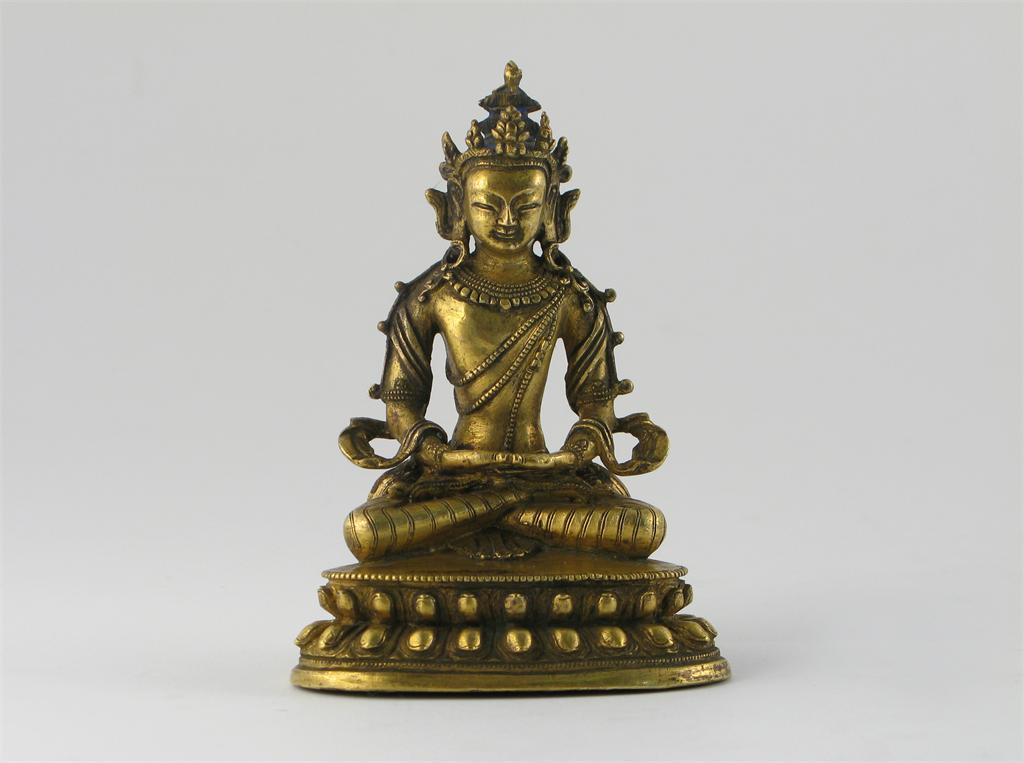 **A Chinese gilt bronze figure of Buddha, seated on a lotus throne, 18th century, 10.5cm.